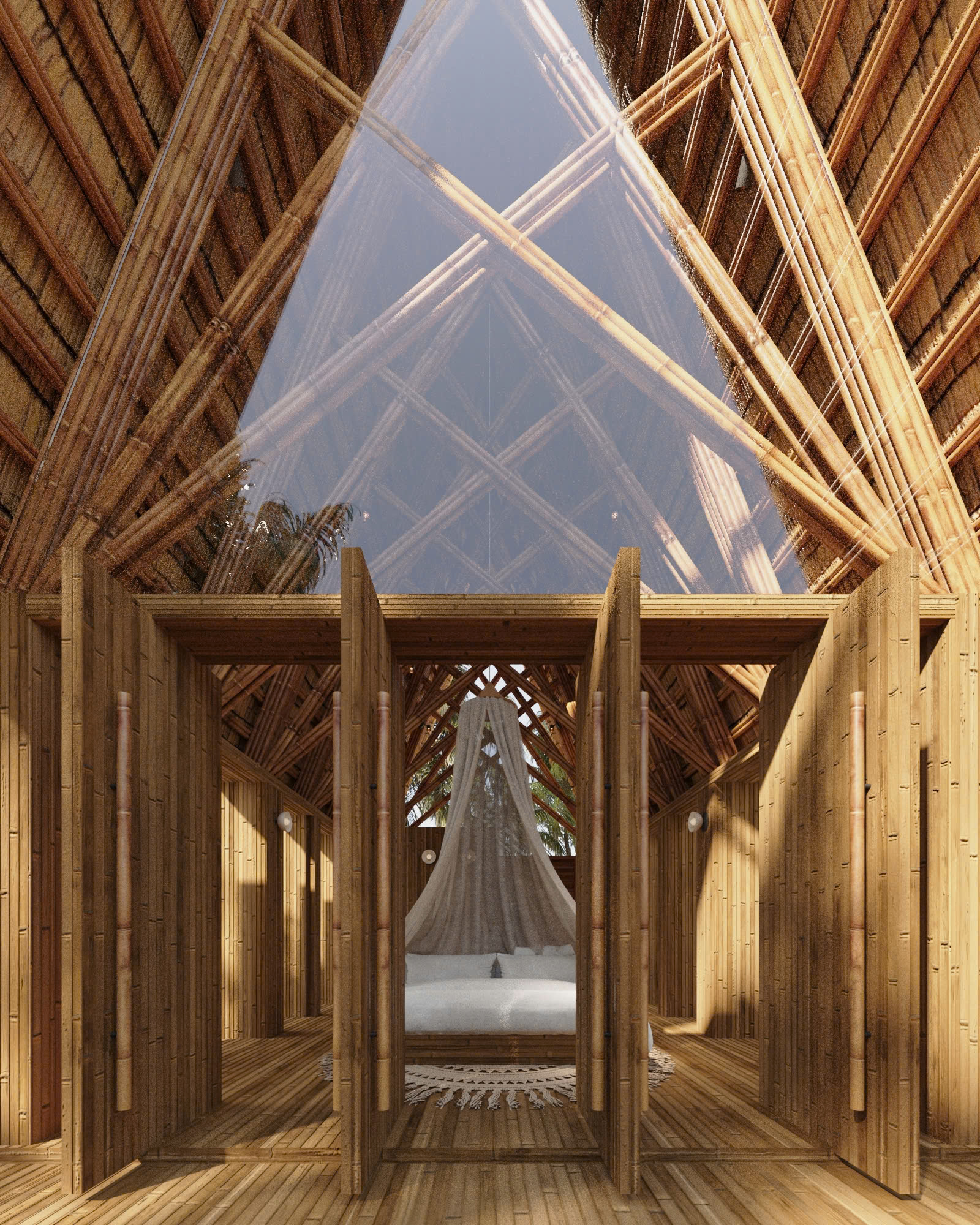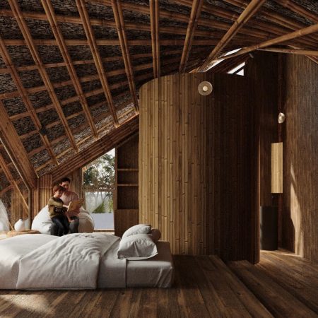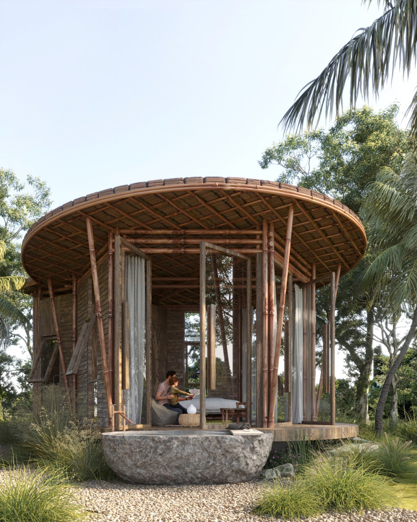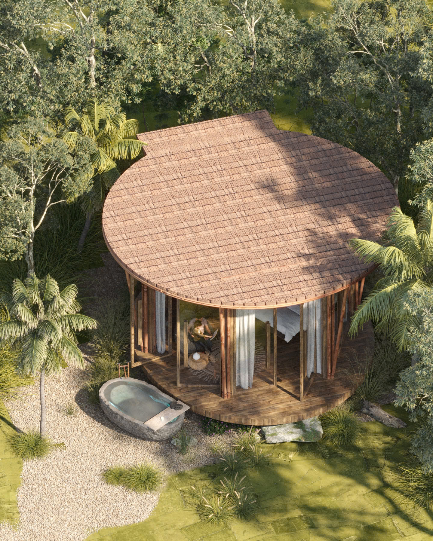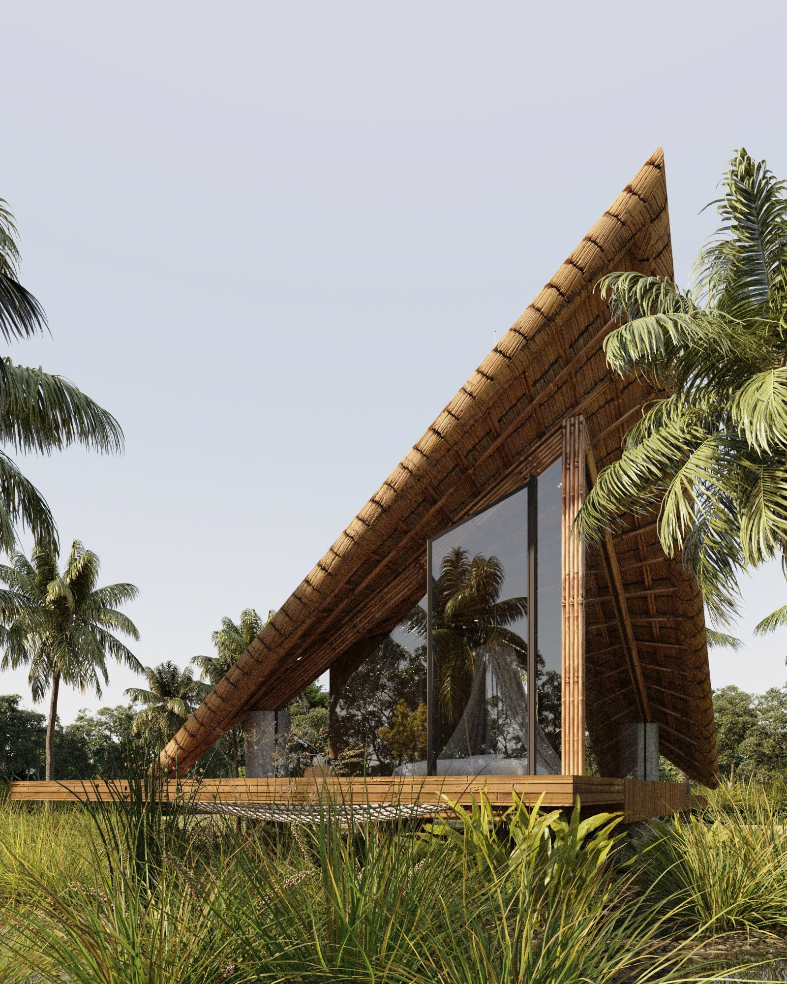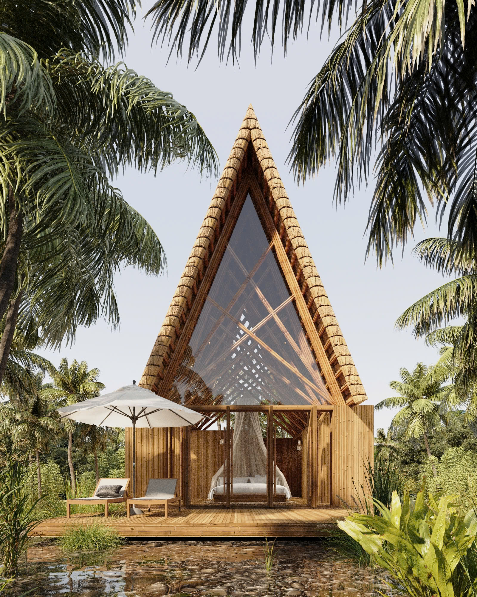 • Hình khối kiến trúc: Bungalow đơn lập 1 tầng – 2 tầng , mái cong hoặc mái chóp truyền thống, thể hiện tính biểu tượng của vật liệu tre.