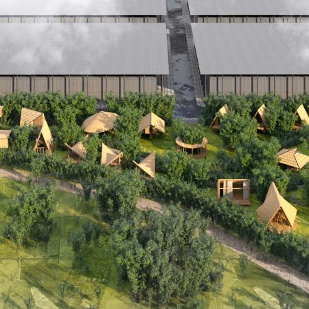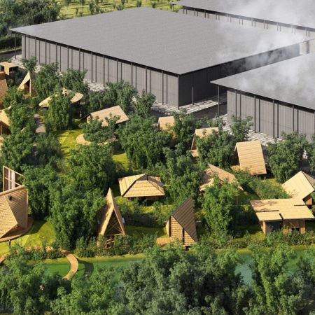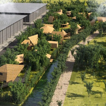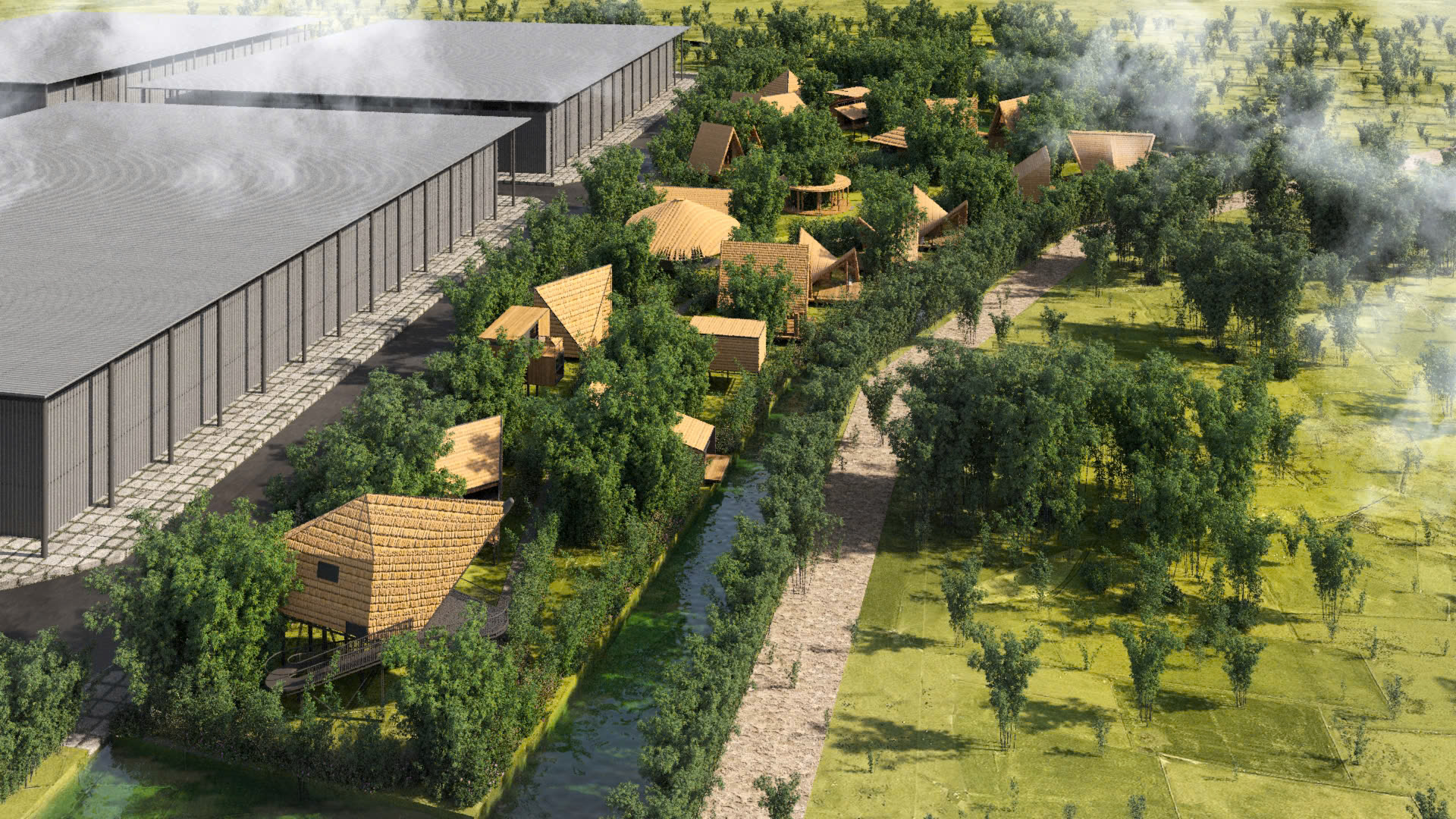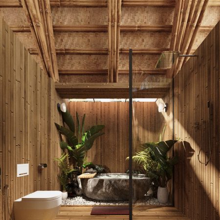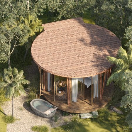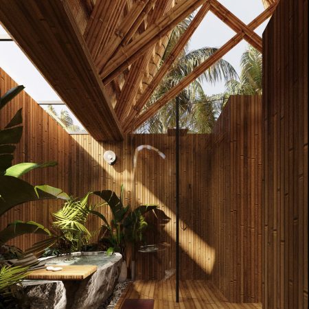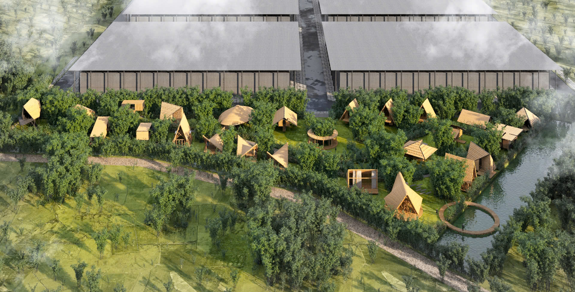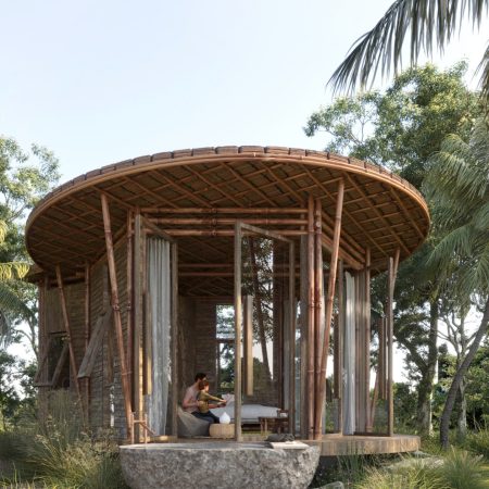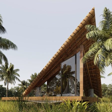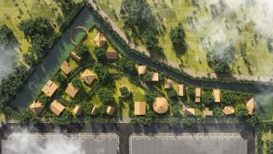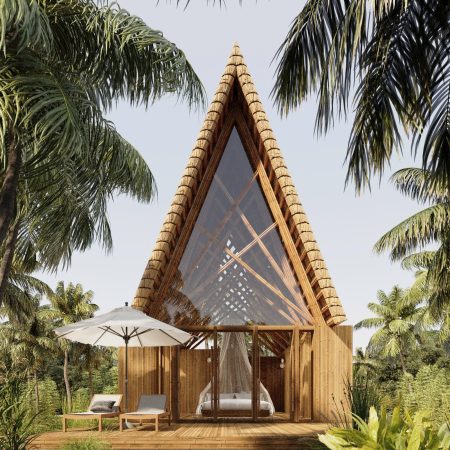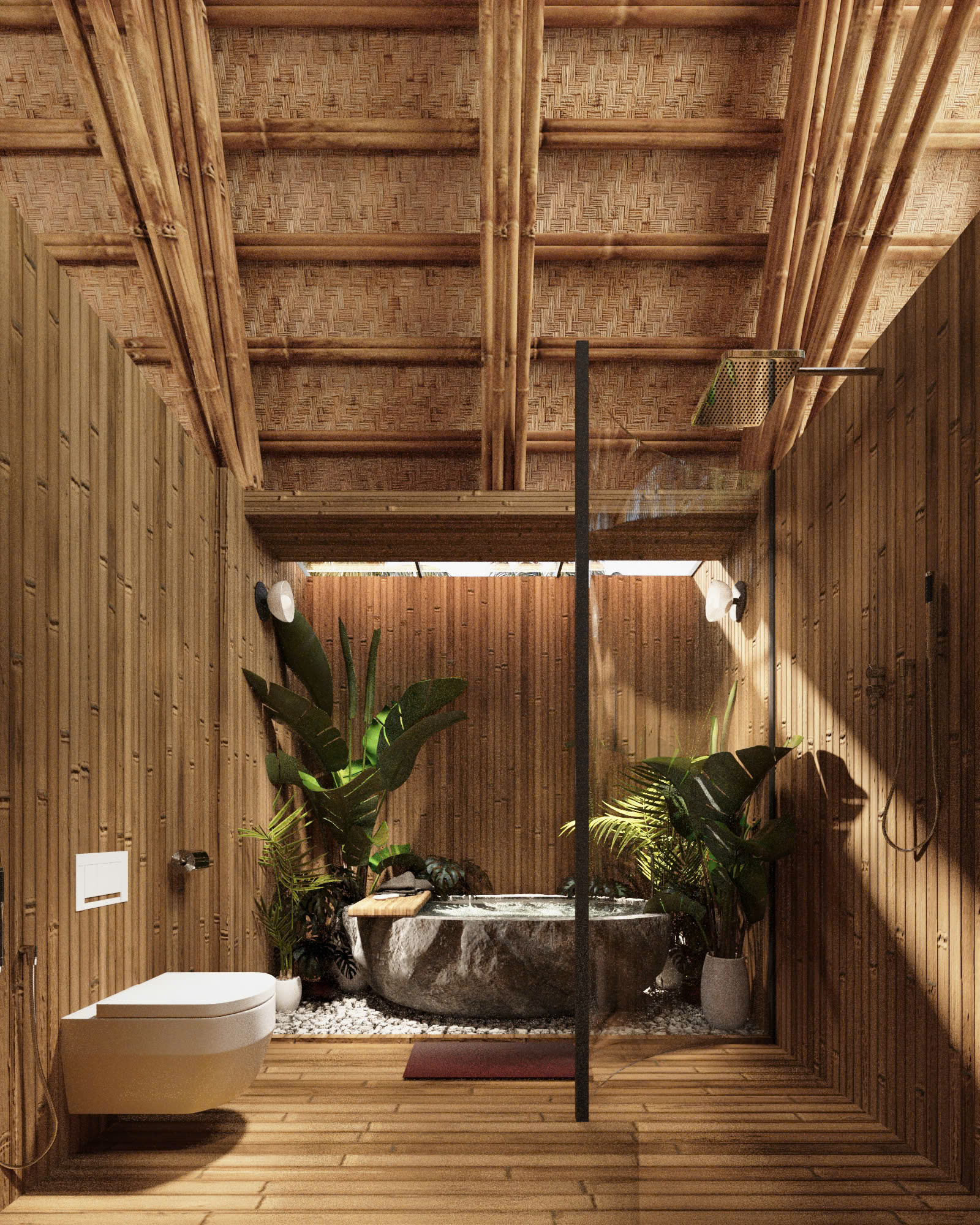 • Hình khối kiến trúc: Bungalow đơn lập 1 tầng – 2 tầng , mái cong hoặc mái chóp truyền thống, thể hiện tính biểu tượng của vật liệu tre.