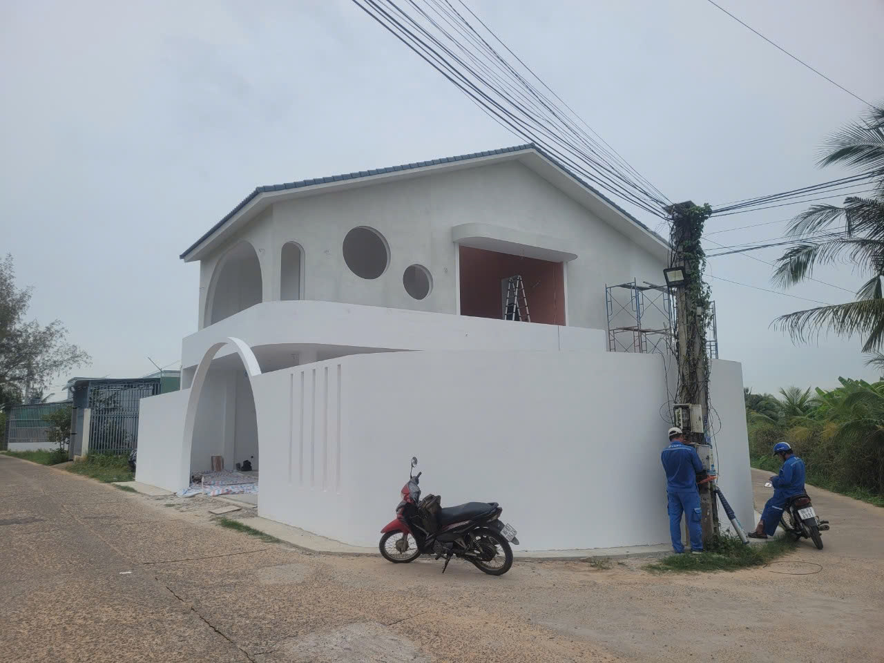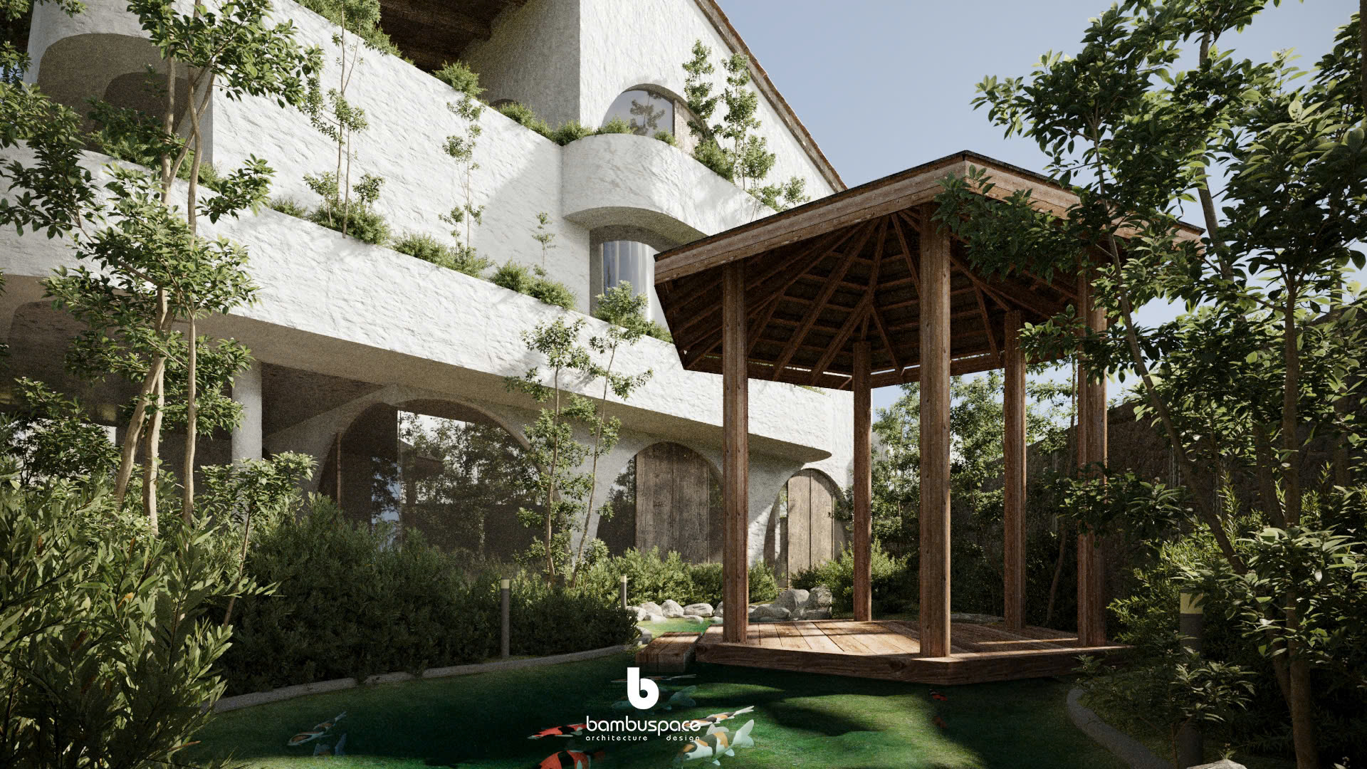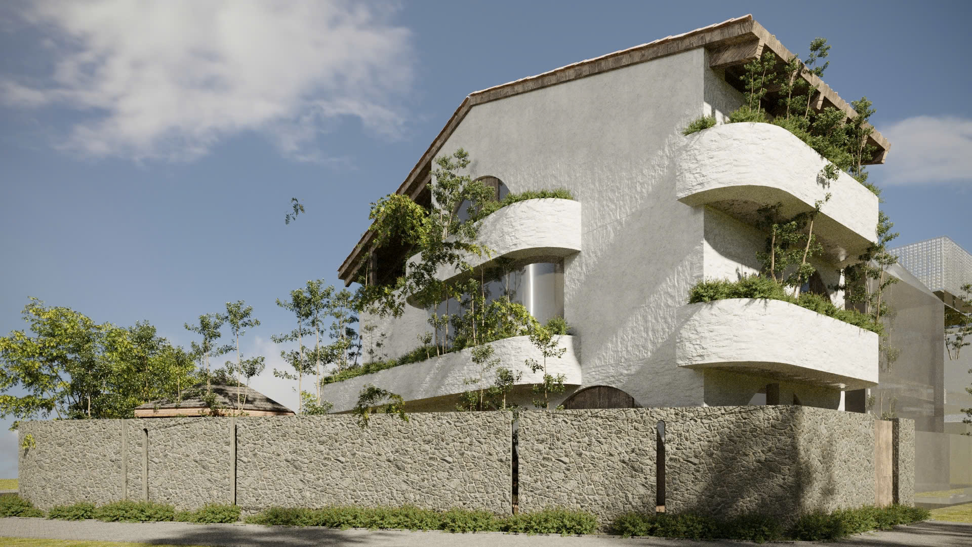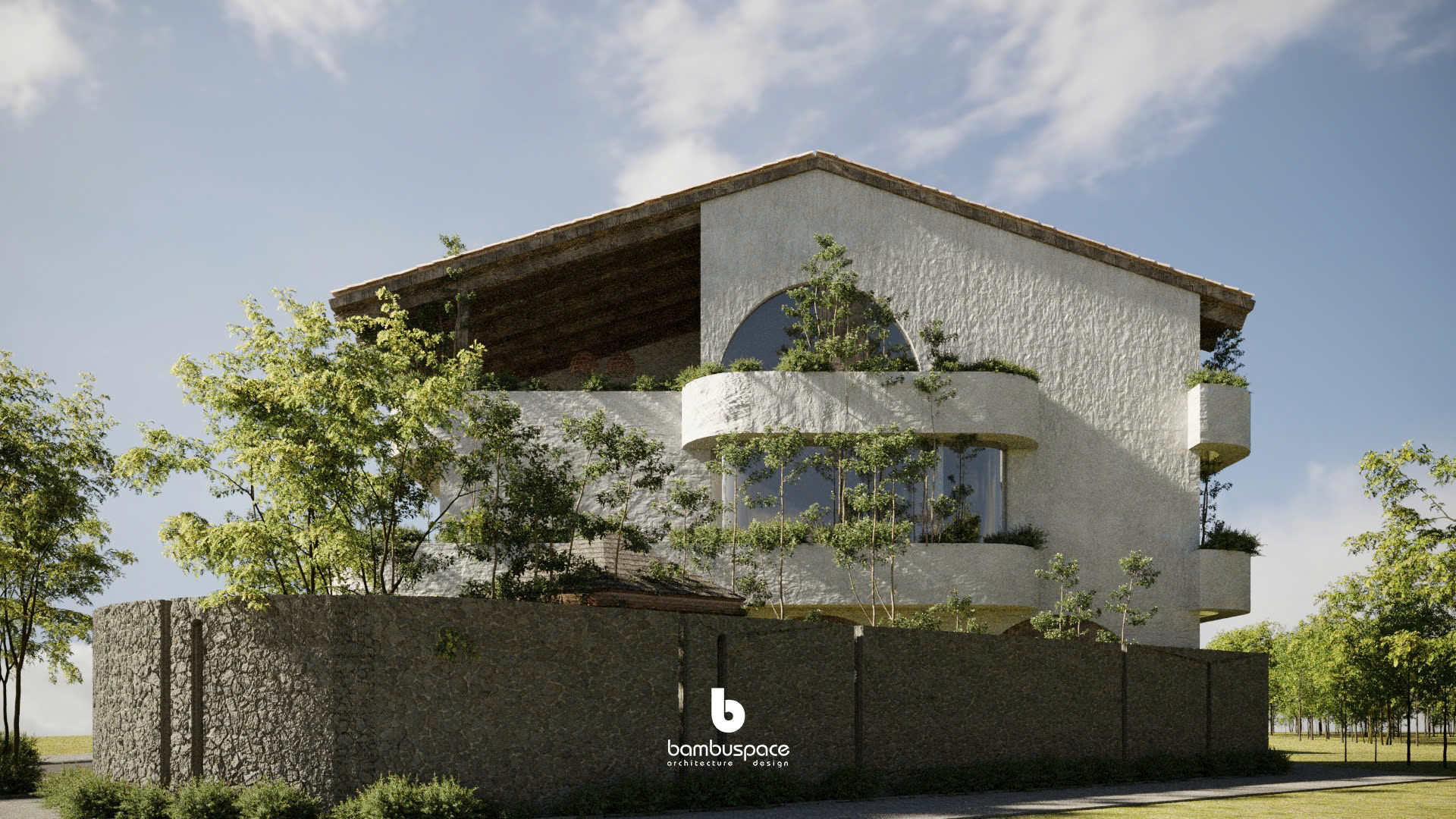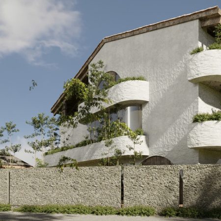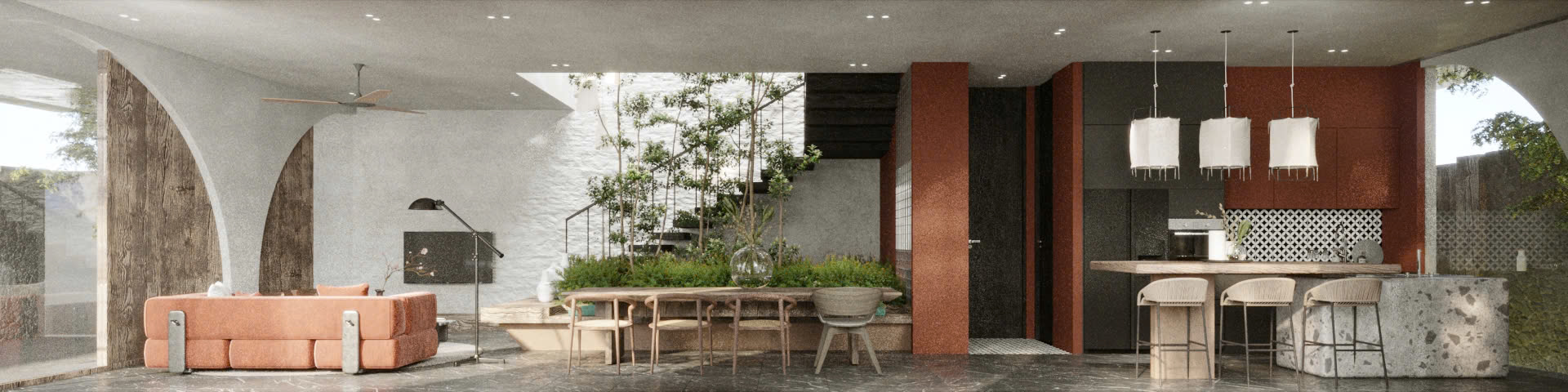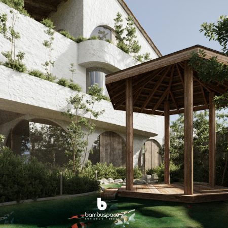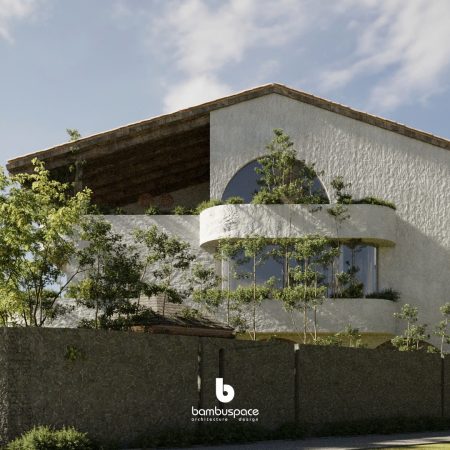 Lấy cảm hứng từ phong cách Địa Trung Hải – với tường vôi trắng, mái ngói đất nung, vòm cong mềm mại – ngôi nhà được thiết kế như một ốc đảo nội tâm: