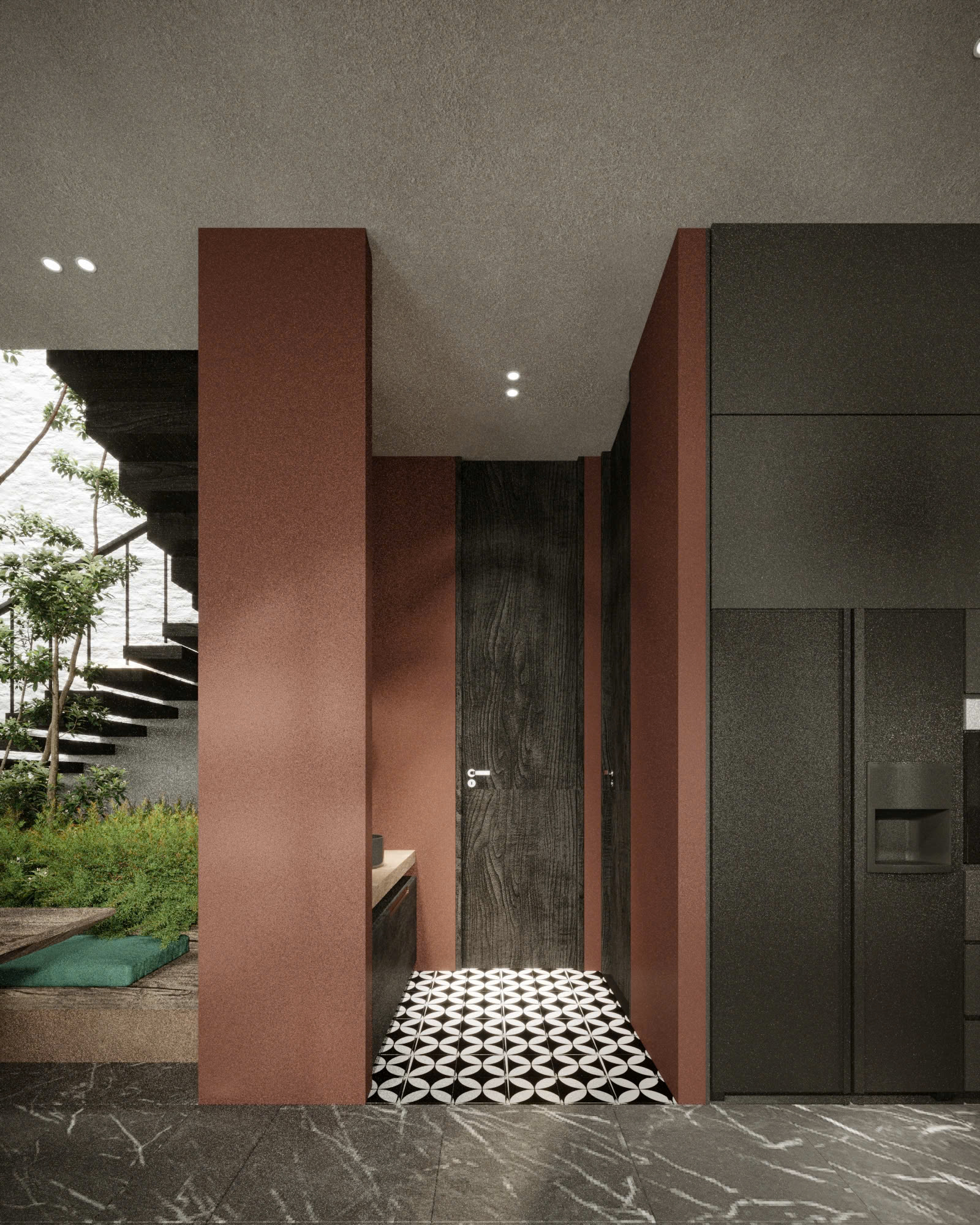 Thông tầng đặt cây xanh giữa nhà, cho bóng mát và đối lưu gió tự nhiên.