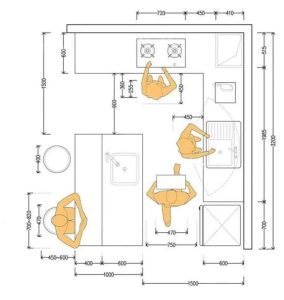 Khoảng lùi bếp – bàn ăn – lối đi phải tối thiểu 90–120cm để phù hợp với cử động của người thao tác.